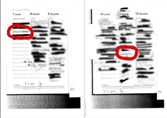 In queste immagini, le pagine sequestrate dell’agenda di Francesco La Motta. L’ex vicecapo dei servizi segreti italiani (Aisi) avrebbe incontrato con cadenza quasi settimanale broker della camorra. L’agenda è stata sequestrata insieme con una rubrica dai carabinieri del Ros, nel suo ufficio nella sede dell’Aisi dove nei giorni scorsi i militari hanno eseguito una perquisizione. I documenti sono quelli che mostriamo nelle foto.