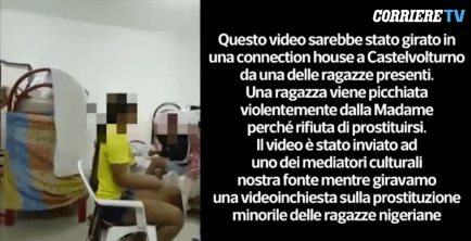 «Secondo l’organizzazione internazionale delle migrazioni nel 2016 in Italia sono entrate 12 mila ragazze nigeriane con il flusso dei rifugiati e richiedenti asilo» spiega Andrea Morniroli della cooperativa sociale Dedalus. «Questo significa per le organizzazioni criminali un investimento pari a 35 mila euro (la quota minima di debito che viene imposto alle ragazze) moltiplicati per 12 mila cioè 420 milioni di euro». Cifre impressionanti che la mafia nigeriana reinveste in droghe e armi alimentando un business criminale spesso sottovalutato. «Va detto che invece il nostro governo sul piano nazionale antitratta investe circa 20 milioni all’anno – aggiunge Morniroli – è evidente che c’è una sproporzione enorme e non si riesce a far fronte all’emergenza». Sarà per questo che guardando il video arrivato ad una delle nostre fonti (un mediatore culturale) mentre giravamo la videoinchiesta sulle prostitute minorenni nigeriane, non ci sorprende più la violenza con cui una madame si scaglia contro una giovane donna che si rifiuta di andare sulla strada. Il video, presumibilmente girato in una connection house a Castelvolturno e inviato da una delle ragazze presenti, mostra un pestaggio molto violento: la madame trascina la ragazza per i capelli, la morde e poi la colpisce con calci e pugni fino a lasciarla a terra, tra il letto e il comodino, priva di sensi.