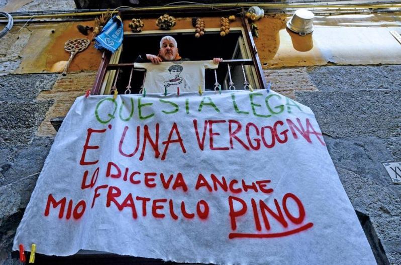 In Italia l’esercizio della libertà sta diventando ordinario momento di insubordinazione. Se esporre uno striscione con la frase di una canzone di Pino Daniele può costare tre anni di carcere e almeno 1500 € di multa significa che ciò che abbiamo ritenuto finora ridicolo può diventare molto pericoloso. Con questo commento sul Corriere del Mezzogiorno mi autodenuncio e denuncio tutti quelli che erano con me a Campagna a settembre a dire che non si possono lasciare esseri umani in mare, che bisogna essere accoglienti con chi soffre e che questo è un paese antifascista: quello striscione è lo stesso dell’iniziativa che promuovemmo io, Giorgio Mottola di Report e Vincenzo Pane. E al nostro fianco tanti artisti come Luca Zulù Persico, Mujeres Creando, Massimiliano Jovine e buona parte dei Terroni Uniti. Questa Lega è una vergogna. Al fianco di Ennio Riviello. On line anche il video del sequestro dello striscione, con i manifestanti che chiedono spiegazioni e la polizia che non sa darne.